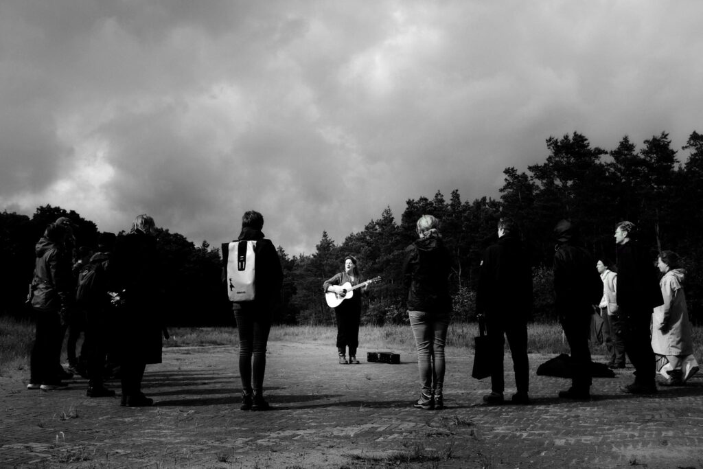 In Lab Landschapspijn dwaalden 30 bewoners van de Veluwe in de lente van 2025 met ecologen, filosofen en kunstenaars 4 zondagmiddagen door Landgoed Warnsborn en over de Koningsheide en de Arnhemse Heide. Samen onderzochten zij hoe klimaatverandering en stikstofneerslag de natuur en onszelf veranderen. Ze deelden kennis, oefenden zich in beter kijken en onderzochten wat het veranderende landschap betekent. Op creatieve wijze gingen zij aan de slag met hun vragen, bevindingen, zorgen, vreugde en onbehagen. Ofwel: filosofisch veldwerk.